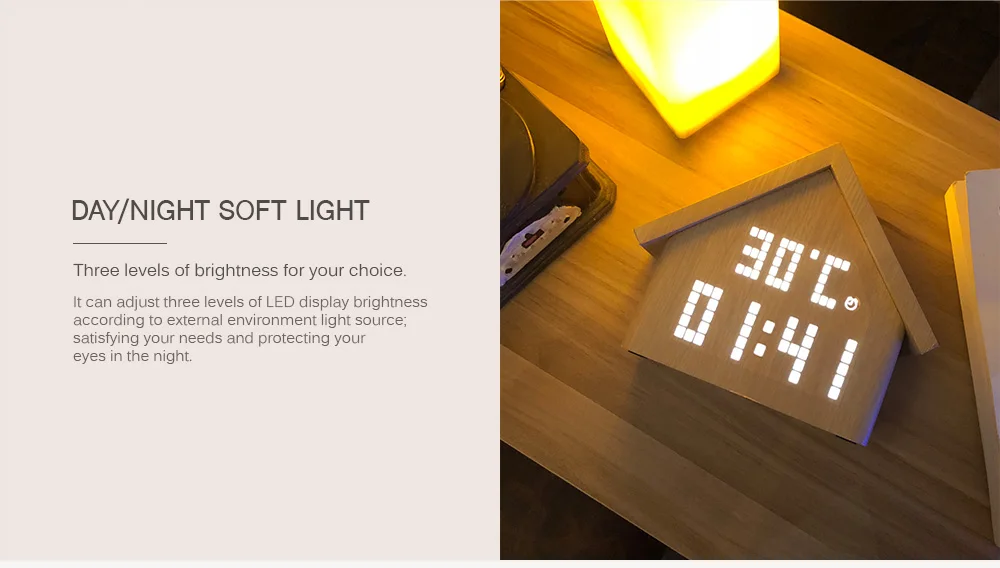 Эти часы являются идеальным прикроватным будильником. Большой экран отображает время и температуру/влажность в реальном времени. Три набора яркости светодиодного дисплея удовлетворяют ваши различные потребности днем и ночью. Бесшумная работа не мешает вашему сну и работе. Идеально подходит для дома, студенческого общежития и офиса.