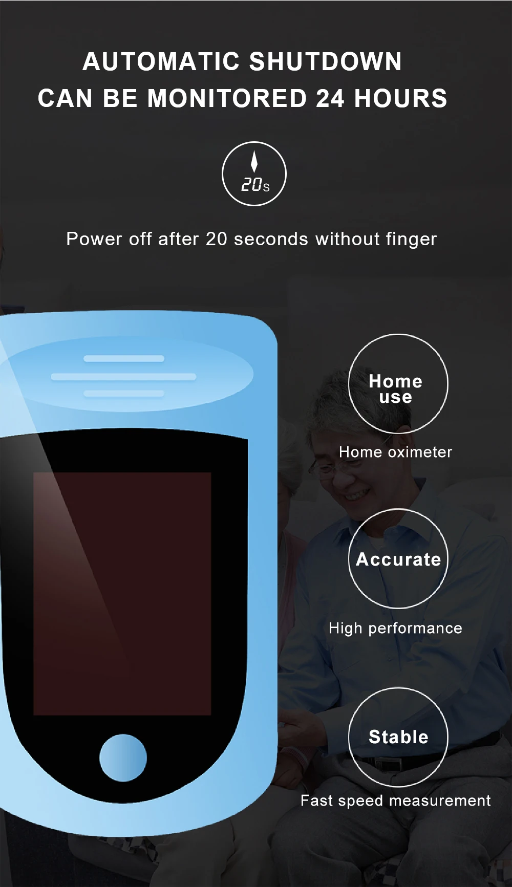 Оксиметр Особенности: 1) может точно измерять SpO2 и частоту пульса 2) дисплей SpO2 и частоты пульса, дисплей штрих-графа 3) индикация низкого напряжения батареи 4) Автоматическое отключение при отсутствии сигнала И уровня кислорода в крови в эксплуатации: ① Нажмите функциональную кнопку на передней панели, включите мощность оксиметра ② Прижмите оксиметр, поместите палец (указательный или средний) полностью в камеру оксиметра, другие пальцы, такие как большой палец, безынерный палец и мизинец, могут быть использованы для измерения. ③ После стабильного отображения формы волны (около 3 ~ 4s) , чтобы считывать данные на дисплее. Высота штрих-графа может указывать на интенсивность импульса. ④ Есть 2 режима отображения, нажмите функциональную кнопку еще раз и может переключиться в другой режим отображения (устройство без датчика направления переключается направление отображения при нажатии функциональной кнопки, устройство цифрового дисплея не может переключить направление отображения) ⑤ Когда палец не находится в месте измерения более 20 с, оксиметр автоматически выключает питание.