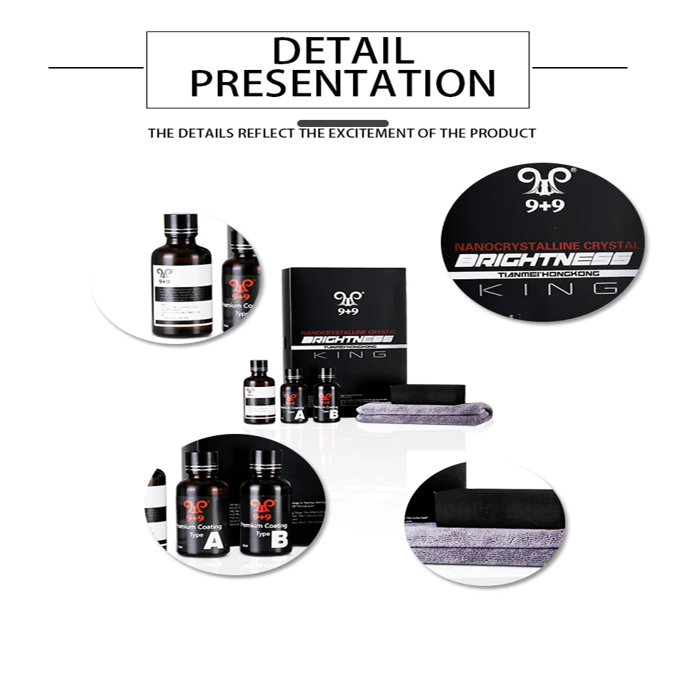 Супер гидрофобное 9H автомобильное нано керамическое покрытие состоит из полисилоксан и других нано-материалов, с характеристиками улучшения твердости и повышения блеска. Он обладает устойчивостью к царапинам, которая может защитить поверхность краски автомобиля. Кроме того, он может защитить ваш автомобиль от старения, выцветания, коррозии погоды и солнечных лучей, кислотного дождя, промышленного порошка и так далее.