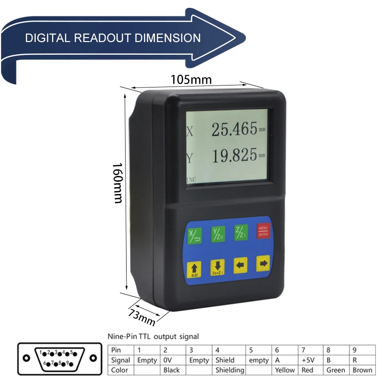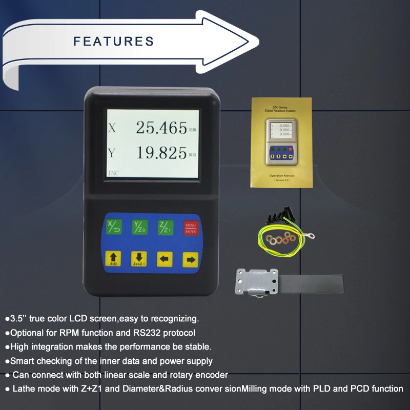 Function:Zeroing,Data Recovery,Value Inputting,Metric and Imperial Switching,Power off memory,Encoder Selection(Rotary or Linear),Linear Compensation ,Counting Direction Setting,ABS/INC Coordinate,200 sets of SDM Coordinates,REF ,Centering,PLD Function,PCDFunction,Radius/Diameter switching,Axis summing,Digital Filtering Function,RS232 Interface,Rotational Speed Measurement,Linear Measuring Basing Rotary Encoder