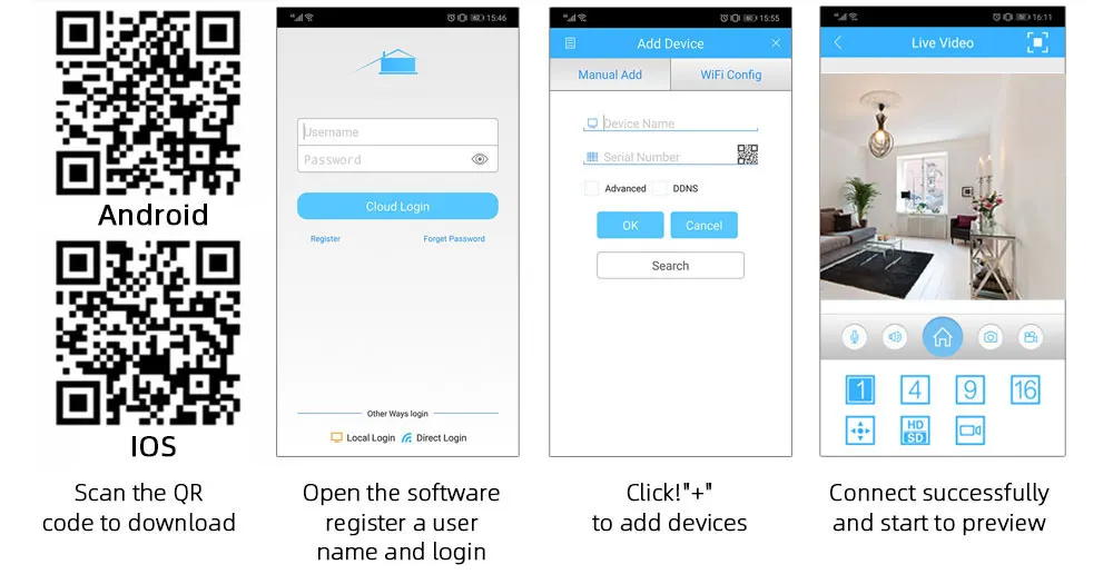 Простая настройка, всего 4 шага для просмотра мобильный телефон, просмотра видео в режиме реального времени из любого места и в любое время с помощью смартфона,