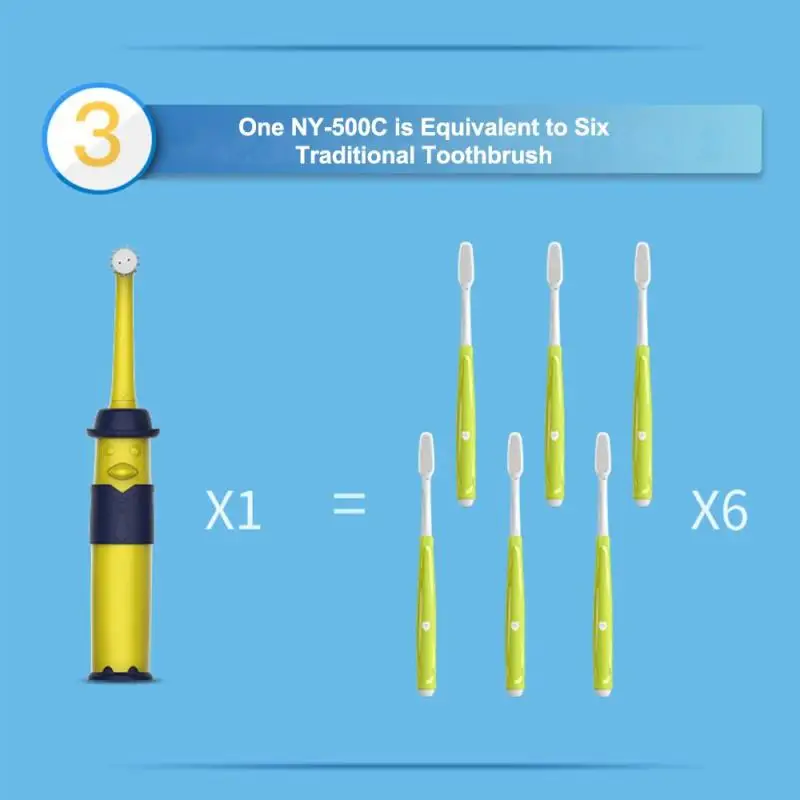 NY-500C умная электрическая зубная щетка IPX7 водонепроницаемый Детская электрическая зубная щетка мягкая щетка для волос чистые зубы в течение 30 s 3-6 лет или От 7 до 14 лет детей (факультативно)NY-500C электрическая зубная щетка может очистить рот глубоко и она может также полностью удалить бактерии из зубов, десен и пародонта. Это отличный подарок для ваших детей, чтобы держать их зубы чистыми и здоровыми. Небольшая щеточка головы и ручки, малый вес, подходит для детей в использовании. Особенности: Запатентованная двойная зубная щетка и мягкие щеточки для волос:Эффективно чистить зубы без мертвых кончиков, привнося вашему детям абсолютно новые зубы опыт. И принимает высококлассную зубную щетку, гладкую для кистей, гиgeian и soft, не ранят десны и зубы детишек. 30 s полностью чистые зубы:30 s быстро очищают ваши детские зубы, что в 6 раз быстрее, чем традиционная зубная щетка, пусть ваши дети научатся любить расчесывание. Оптимальная частота вращения и интенсивность для детей:Использование оптимальной интенсивности для очистки зубов имеет более высокий уровень ухода за зубами, И он поддерживает интеллектуальный контроль частоты вращения. Выгодно для роста зубов. IPX7 Водонепроницаемый:Средство для зубных щеток, способное обезжирить воду, безопаснее и долговечнее, дети могут чистить зубы при созревании, не беспокойтесь об электрическом шоке. Чистки зубов резко:Метод очистки окклауса, легко очищающий зубы от вверх и вниз, внутри и снаружи. Чистка и уход за зубами детей от 360 ° Основные моменты: 1. высокосортная зубная щетка для волос:Принимает высококлассные зубные щетки для волос, hygeian и soft, не наматываются резинки. 2. помпоны:Помпон очень устойчивый. В случае температуры и влажности, имеет большие изменения, она не будет поражена. 3. очистить зубы от шести Сторон:Метод очистки окклауса, легко очищающий зубы от вверх и вниз, внутри и снаружи. 4,30 S умная Чистка ваших детских зубов:Встроенный 30 s время, напомнило раз в 10 s, Invert один раз в 5S, остановить чистые зубы после 30 s 5. Легко использовать:Одна кнопка для работы. 6. прекрасный дизайн:Мультфильм паттерн, три факультативных цвета (желтый, розовый и синий), дети будут любить чистить зубы. Совет: щеточки зубы дважды каждый день, 2 * AA щелочные батарейки (в комплект не входят) может длиться до 1 месяца (Примечание: Пожалуйста, измените 2 * щелочные батареи AA своевременно, прежде чем батареи мертвы.) Технические характеристики:Модель: NY-500CТип товара: Детская электрическая зубная щеткаМатериал: помпон Материал s + ABS пластик + ПЭ пластик + высококачественный силиконБатарея: 2 * AA батарея (в комплект не входят)Возраст: подходит для S: kids 3-6лет старый или М: 7-14лет (опционально)Цвет: желтый, розовый, синий (опционально)Посылка Размеры: 20*6,5*3 см/7,87*2,56 * 1.18inПосылка Вес: 200 г/7,0 унц. Посылка списки:1 * Электрический Зубная щётка1 * Руководство пользователя