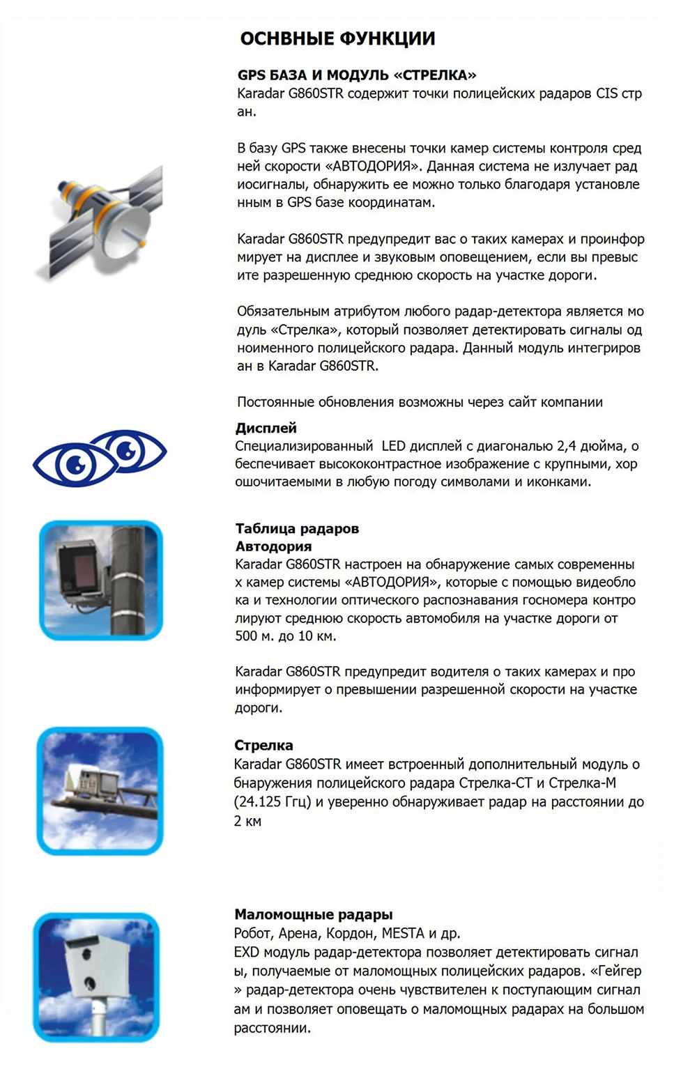 Обнаруживаемый X/K/Laser/Strelka(CT) Это частота мобильной передачи данных радара, которая варьируется в зависимости от страны. Радар, который мы продаем в основном с использованием российского радиолокационного спектра, может быть продан в Россию и соседние страны. GPS позиционирование, когда GPS захватывается на спутнике, выбирает местные часовые зоны, чтобы точно отображать местное время. Мы используем лучший модуль Ublox 8, который улавливает спутниковые сигналы GPS и фиксирует ГЛОНАСС. При перемещении Радиолокационное оборудование может показать вашу скорость, расстояние от фиксированной точки, И ограничение скорости в разделе. Конечно, мы импортировали локальные данные в память. Это будет так точно. Экран дисплея цифровой трубки (дисплей FND), предыдущий радар, показывает один цвет, в то время как g-860str цвет разнообразен и дает водителю визуальную стимуляцию. Настройка функции Свободно контролировать громкость вверх/вниз Свободно выберите переключатель включения/выключения ремешка