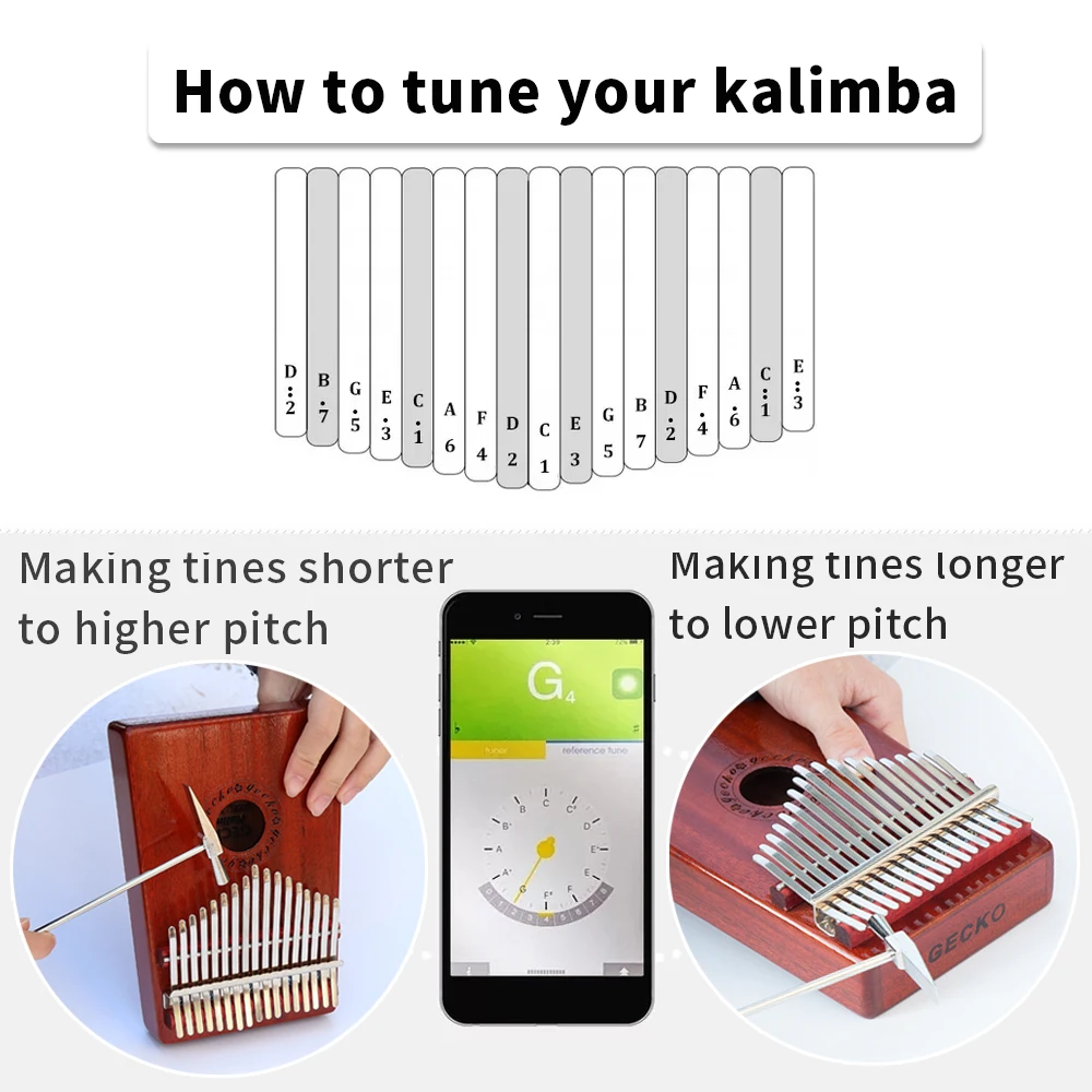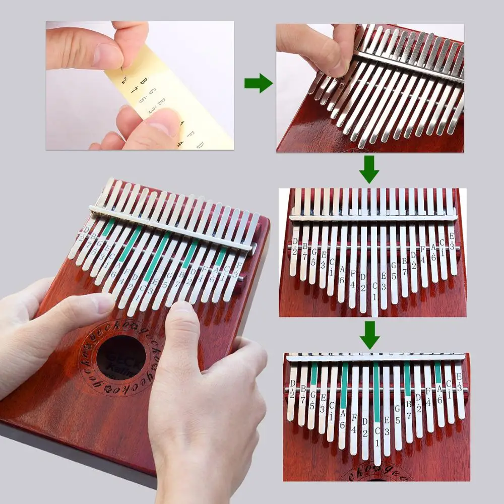 Новичок: вы можете наклеить фонетический знак на ключ или другие уникальные способы, которые вы хотели бы. Это более удобно для вас, чтобы играть. Профессионалы: Просто снимите отметку фонетических наклеек, когда вы хорошо овладеете калимбой. Может быть преобразован в ключ B: вы можете конвертировать Ключ C в ключ B с регулировочным молотком, если вам нужен ключ B во время игры kalinba