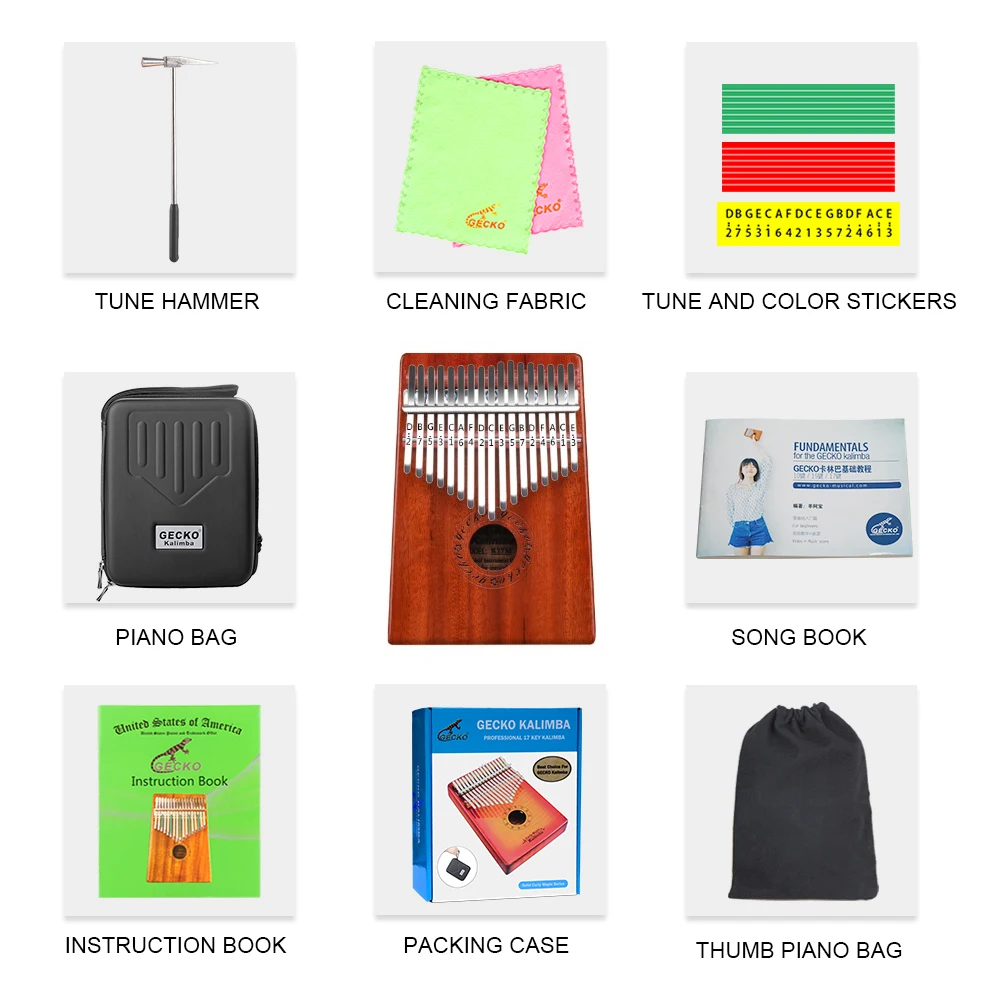 1*17 ключей калимба 1 * Инструкция 1 * учебная книга 1 * Tune Hammer 1 * Настройка наклейки 1 * коробка калимба 1 * салфетка для очистки 1 * тканевый мешок