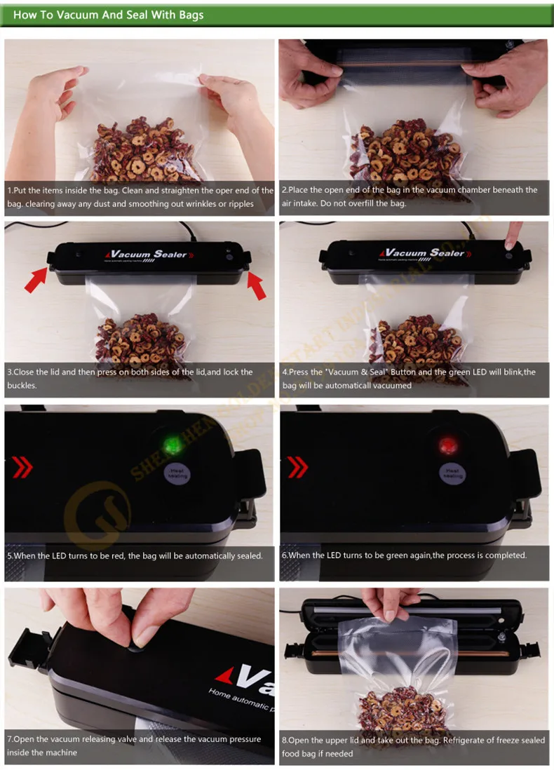 4. Нажмите кнопку "вакуум и уплотнение" и зеленый светодиодный мигнет, сумка будет