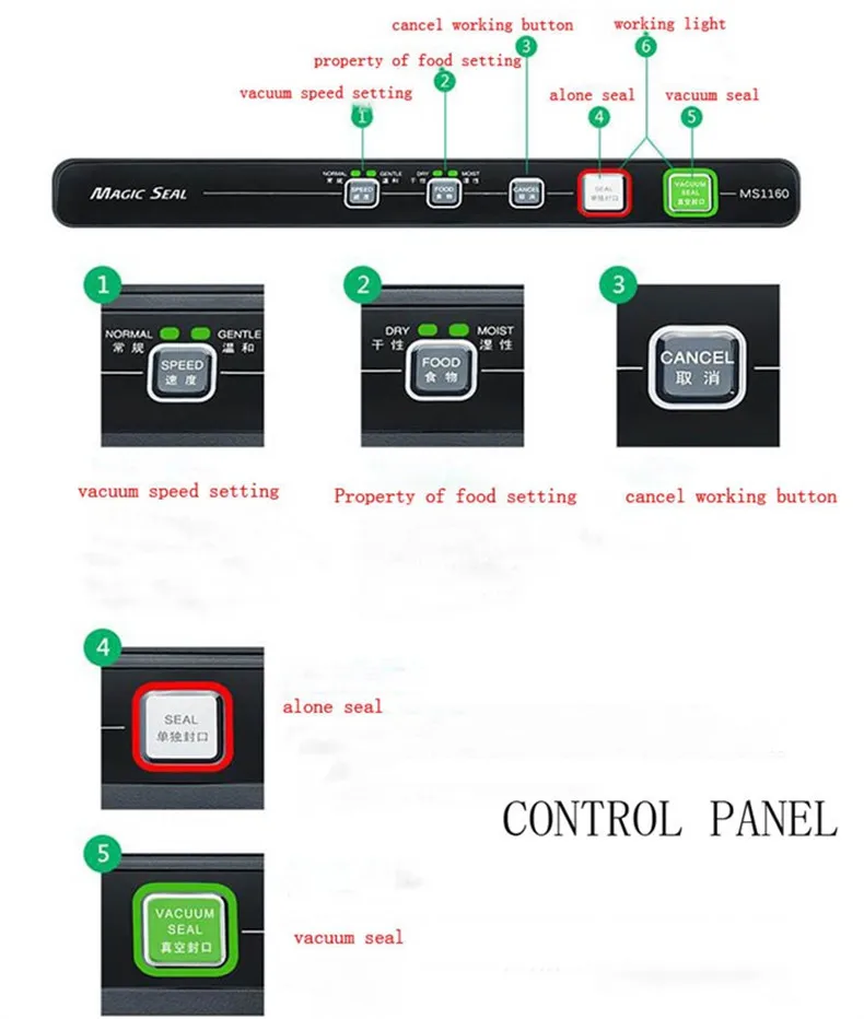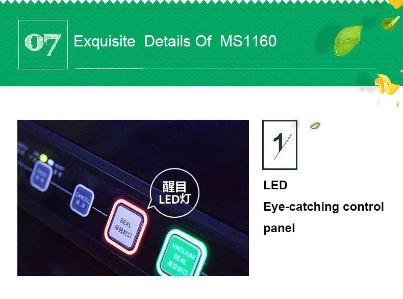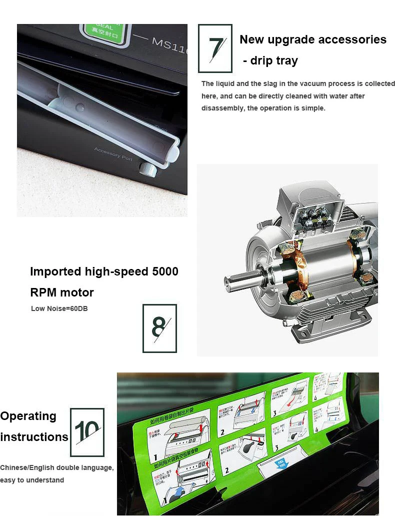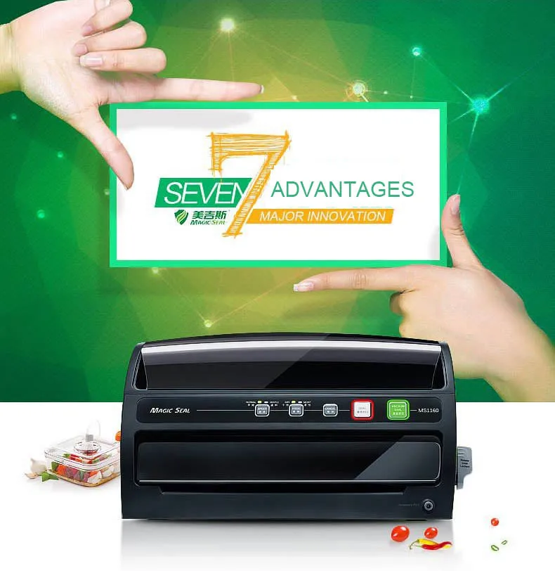 Название продукта: волшебная вакуумная Уплотнительная Машина Модель: MS1160 Напряжение: 110 В/220 В Мощность: 200 Вт Ширина нагревательного провода: 3 мм Может быть герметичный мешок шириной: 30 см Степень вакуума:-60 см/рт. Ст.,-0,8бар ± 3% Машина Размеры: 40,5 см * 12 см * 21,5 см Weigth машины: около 2,9 кг Материал: Корпус: ABS + PC, Нагреваемый стент: нержавеющая сталь SUS301, Уплотнительное кольцо: силиконовая резина SIL, Высокотемпературные материалы: японский импортный тефлон, Мотор: импортный высокоскоростной мотор без углерода 5000 Режим работы: Автоматическое/ручное управление