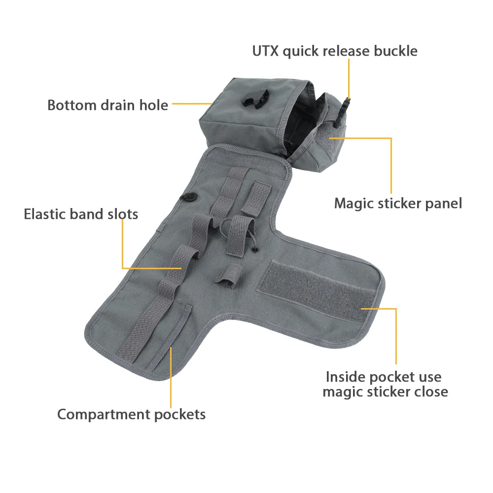 Изготовлен из высококачественного и прочного нейлонового материала 500D Cordura, эластичной ленты, волшебной наклейки и пряжки UTX Duraflex. Отличный аксессуар для наружного применения.