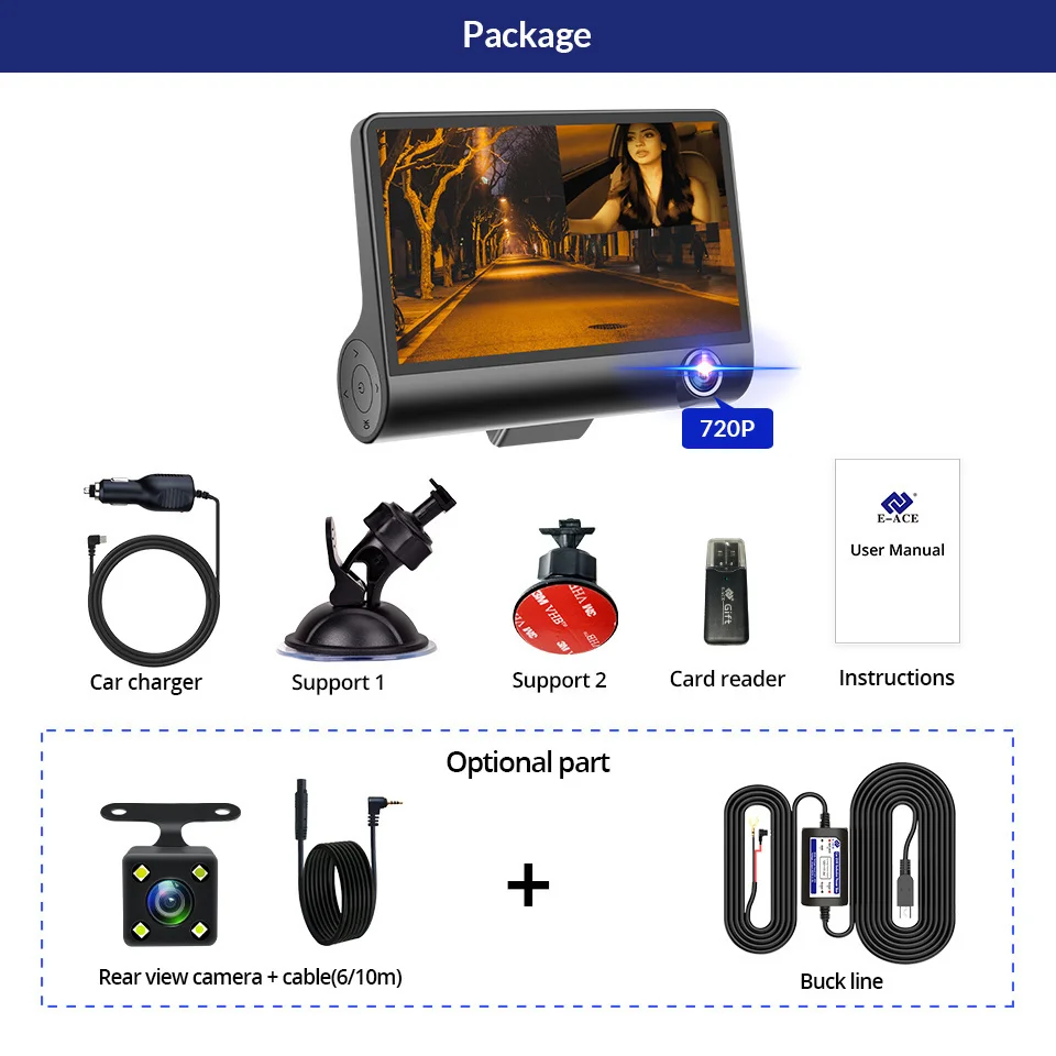 в автомобиле E - ACE B28P была загружена видеокамера DVR 3 с видеокамерой 4,0 дюйма CarLog с двумя объективами, поддерживающими видеомагнитофон задней камеры с автоматической регистрацией CarLog