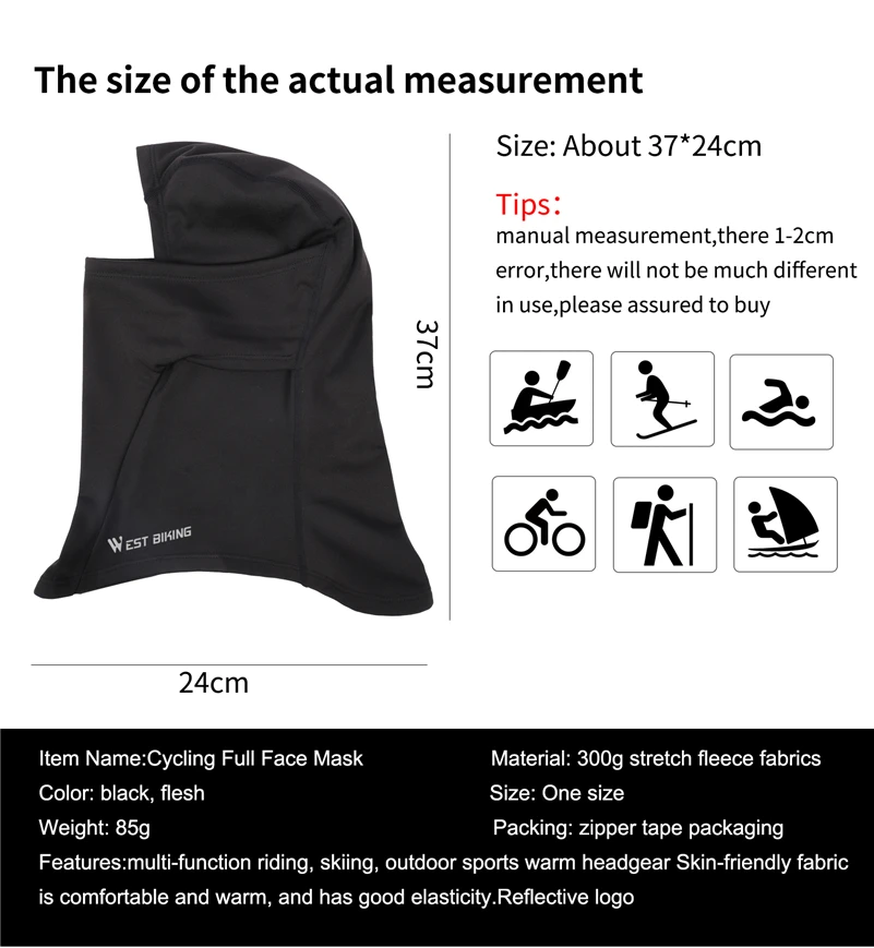 --------------------------------------------------------------------------------------------------------------------------------------------------------------------------------------------G Style Full Face MaskMaterial:300g stretch fleece fabricsGender:UnisexColor:Black,Fresh,GraySize:37*24cm (One size fits all)Size:One sizeWeight:About 85gAbout WEST BIKING
