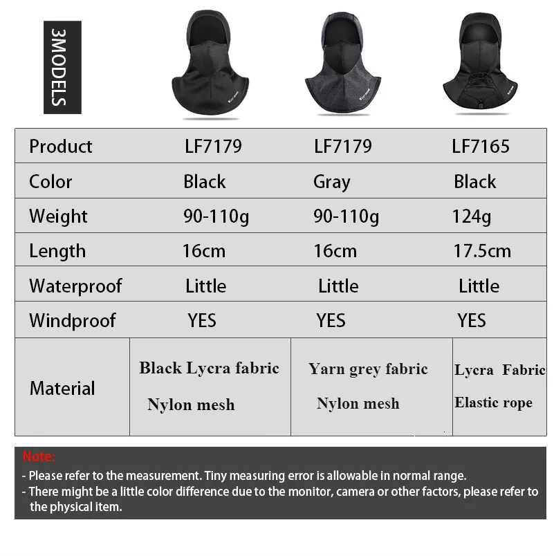 Color black Gray blackWeight 90-110g 90-110g 124gLength 16cm 16cm 17.5cmWaterproof little Little littleWindproof YES YES YESMaterial Lycra Lycra Lycra, Mesh, Bobbinet Nylon Mesh Nylon Mesh 15 mm Elastic cord 15 mm Elastic cord Note: - Please refer to the measurement. Tiny measuring error is allowable in normal range. - There might be a little color difference due to the monitor, camera or other factors, please refer to the physical item.
