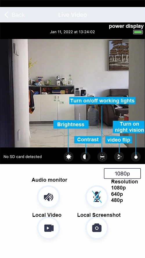 Ночное видение может быть включено/выключено через приложение (ночное видение недостаточно хорошо для этой мини-камеры, пожалуйста, обратите внимание, если вы слишком заботитесь)