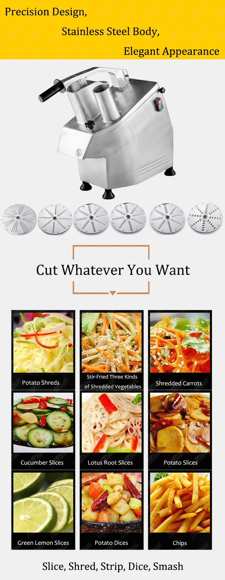 1. Корпус из сплава магналия, изящная фигурка 2. Многоцелевой: нарезка, решетка, шинковка и нарезка на чипсы или кубики всех размеров 3. Высокая производительность, универсальный выбор, отличная работа и низкий уровень шума 4. Легко моется и соответствует стандарту гигиены. 5. Это идеальное оборудование для отелей, ресторанов и пиццерий 6. Прозрачная крышка с магнитным предохранительным устройством 7. Более функциональные диски на ваш выбор