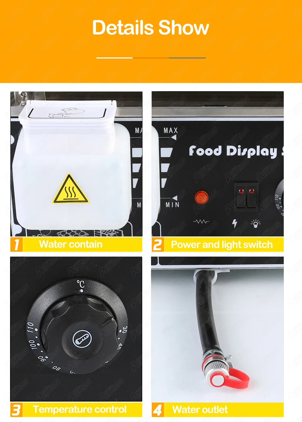 1. Пищевой корпус из нержавеющей стали, безопасный, здоровый и не ржавый; Не беспокойтесь о непосредственном контакте с пищей. 2. Большая емкость, посылка включает в себя две верхние пластины, вы можете переключиться на использование и поставить 4 шт 15-16 см Деревянный отпариватель или 1 шт 26-36 см Деревянный отпариватель. 3. Высокоэффективный нагревательный элемент с автоматическим контролем температуры. Быстрое нагревание, производство пара на 80 С. 5л большой резервуар для воды. Встроенная функция предварительного нагрева, которая экономит больше энергии и энергии. 4. Встроенное устройство безопасности, которое может защитить машину от нехватки воды. Предотвращает сухое отопление, надежная производительность. 5. 110-120 В или 220-240 В на заказ