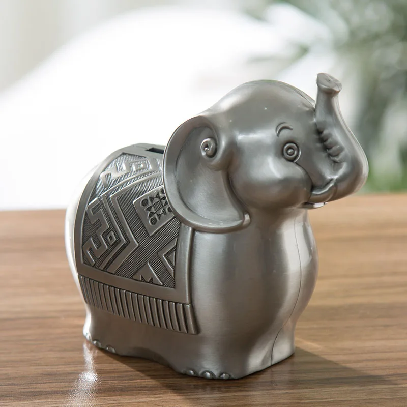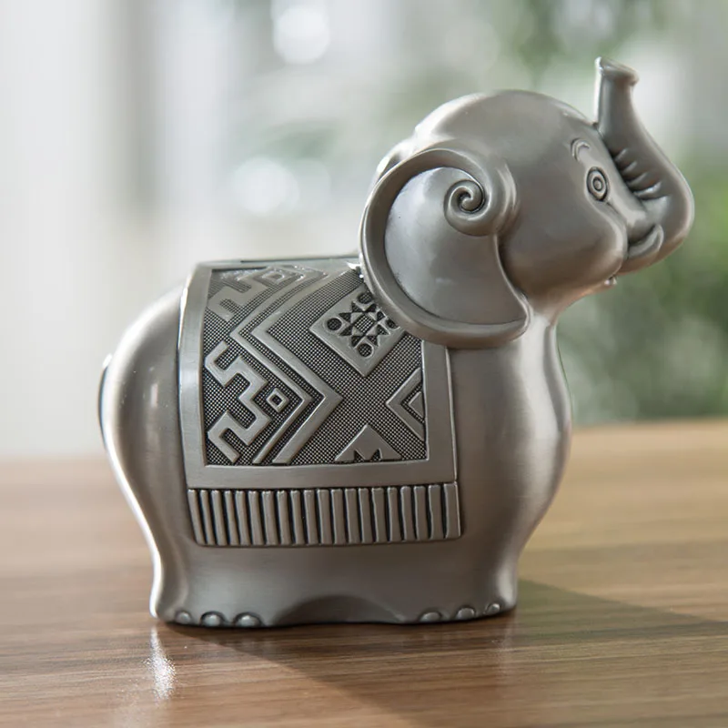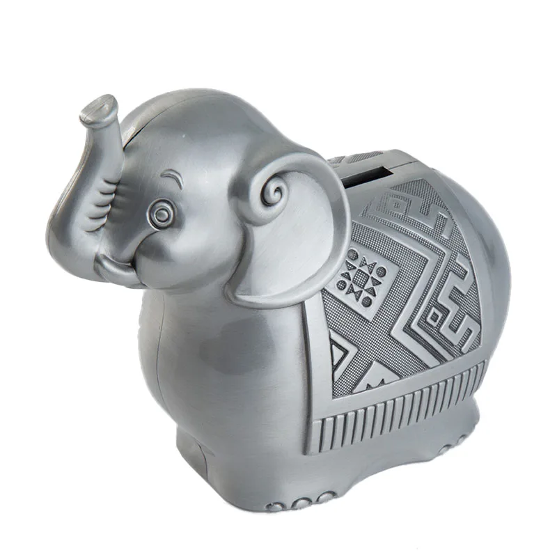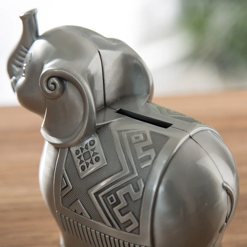 Antique Pewter Elephant Shape Metal Bank Box With Embossed Texture Carved On Zinc Alloy Animal Design Children Coin Storage Case