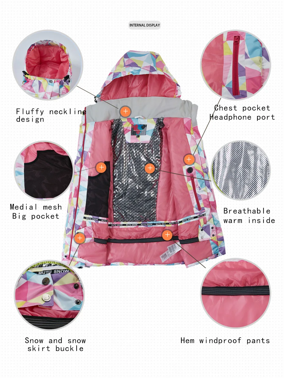 Один выбор, один сюрприз: китайский известный бренд-Официальный магазин MUTUSNOW 1. Водонепроницаемый коэффициент 10000 2. Коэффициент проницаемости 10000 3. Эффект тепла-30 градусов 4. Внутри сделан теплый светильник DuPont из хлопка 5. Дизайн с патентованным принтом, модный и великолепный 6. Встроенная снежная юбка, эффективно предотвращает попадание дождя и снега, уменьшает потерю температуры.