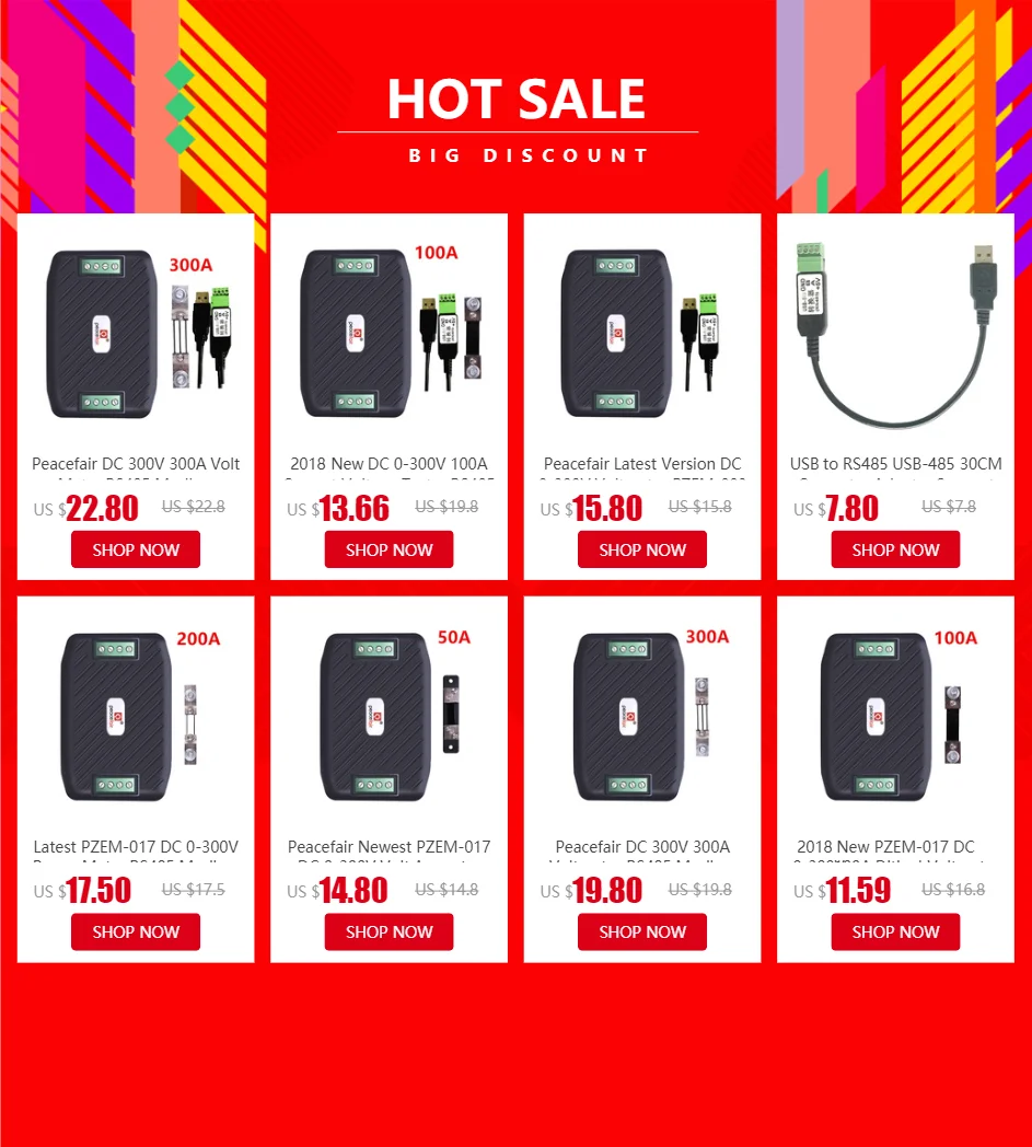 PZEM-017: диапазон измерения 50A, 100A, 200A, 300A (Диапазон тока зависит от спецификации внешнего шунта)