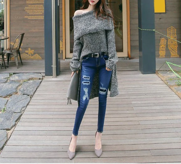 Название:Женский вязаный свитер RealShe, однотонный Асимметричный свитер с длинными рукавами и воротником-стойкой, зима 2019