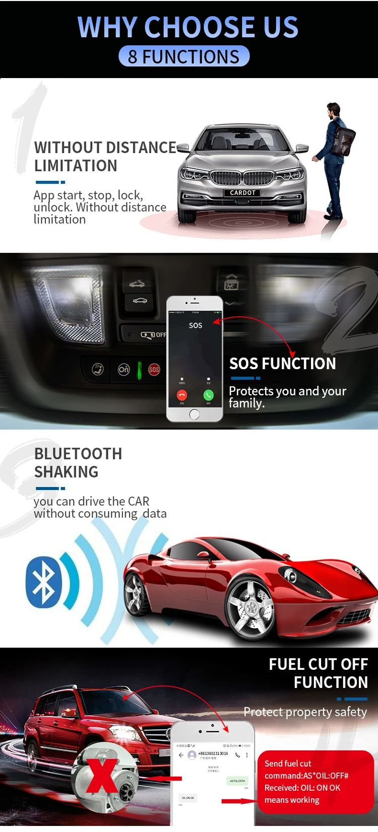 Этот продукт специально разработан для пользователей, у которых есть кнопка запуска на оригинальном автомобиле. Вам не нужно менять кнопку пуска и клавишу на оригинальном автомобиле. Наш продукт добавляет функцию управления автомобилем на ваш мобильный телефон. 2g gps настроен ниже-версия без функции sos.