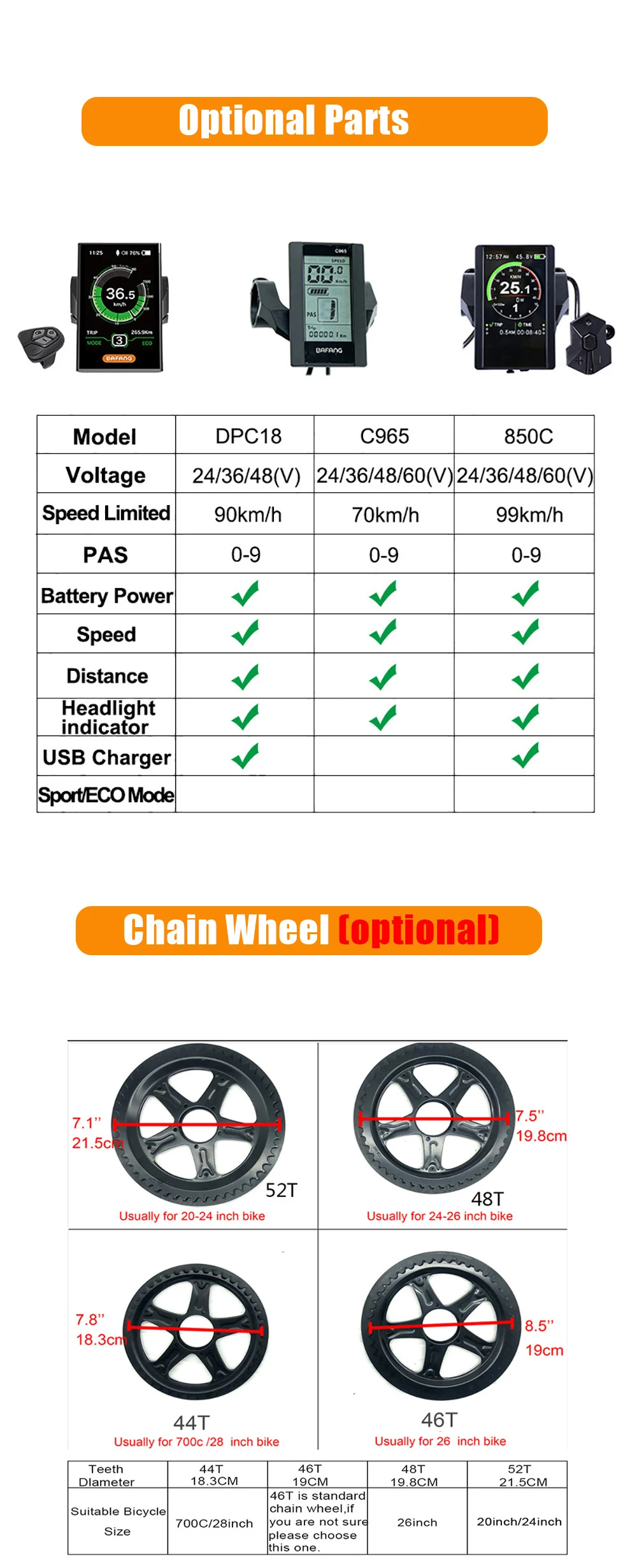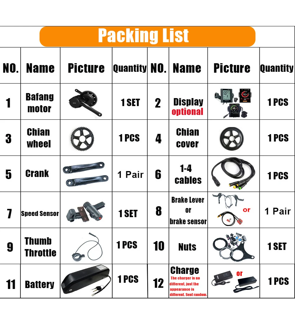 1. Bafang mid мотор 48В 750W2. 48V16AH батарея3. Зарядное устройствоЕС/США/Великобритания/Австралия/китайское стандартное зарядное устройство поставляется, пожалуйста, сообщите нам стандарт зарядного устройства в заказе!)4. Велосипедный фонарь5. Датчик передач6. Зубчатое колесо цепной передачи7. Крышка цепи8. Левая рукоятка + правая рукоятка9. Дроссельная заслонка10. BBS инструмент11. C965/TFT850C/DPC-18 дисплей12,1 до 4 кабели13. Датчик скорости и магниты14. Тормозной рычаг15. ОрехиГарантия