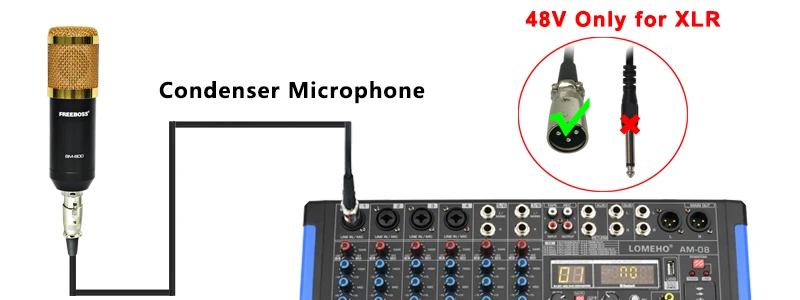2. При включении фантомного питания + 48 В, Все входные разъемы микрофона имеют фантомную мощность + 48 В.