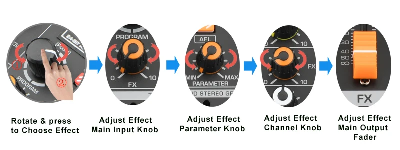 1)Поверните ручку программы, чтобы выбрать эффект и нажмите кнопку, чтобы подтвердить эффект.2) Поверните главный Входной регулятор эффекта для регулировки входного объема эффекта3) поверните регулятор параметров эффекта для регулировки входного эффекта.4) поверните регулятор входного канала эффекта для регулировки входного объема канала5) Регулировка эффекта основной выходной фейдер.Функция USB: