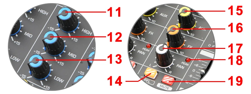 Пиковый светодиодный индикатор горит, когда входной сигнал управляется слишком высоко. Если это произойдет, откажитесь от усиления. При необходимости проверьте настройки эквалайзера канала.