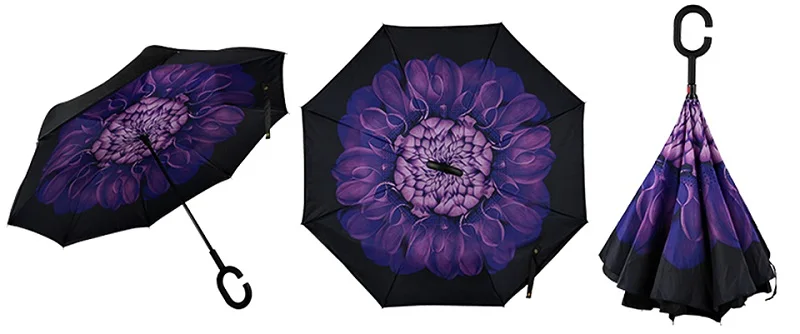 It adds a nice twist to our classic umbrella by turning inside-out when you're not using it. In this way, the dry inner side of the umbrella comes on the outside, keeping the wet side away to keep you dry when you make it in from the rain. Easy and safe to use With a simple click and push, you can open and close the umbrella in confined spaces when entering or exiting a building or car and it's less awkward and more safer to open and close when in crowds, since the danger to poke in people's eyes has been removed by the design. Self stand and drip free It can stand up on its own, ideal for when you have nowhere to prop your umbrella up against. It will also keep the wet part of the umbrella inside once you've closed it, so things don't get dripped on when you put it away after coming indoors. Durably windproof The straight umbrella easily slices through all winds. Due to its aerodynamic design, the umbrella always finds the most comfortable position in the wind which makes it exceptionally pleasant to use, even in strong gales. If the canopy flips, it can be rectified at a push of the button.