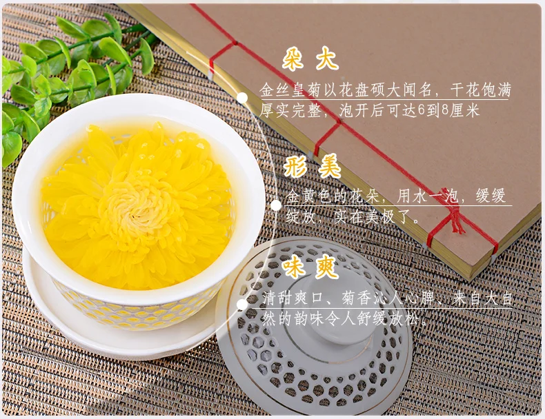 Chrysanthemum has high content of flavonoids, rich in amino acids, vitamins and trace selenium. The petals of Chrysanthemum morifolium contain a variety of amino acids, vitamins and trace selenium elements, most of the flavonoids can also permeate into the water. Smell fragrant, can eliminate heat, Shengjin, dispel wind, moisten the throat, nourish the eyes, antialcoholic, lower blood pressure, eliminate cancer cells, expand the coronary artery and bacteriostatic effect, long-term drinking can increase human calcium, regulate cardiac function, reduce cholesterol, suitable for the elderly and prevent epidemic conjunctivitis when drinking.