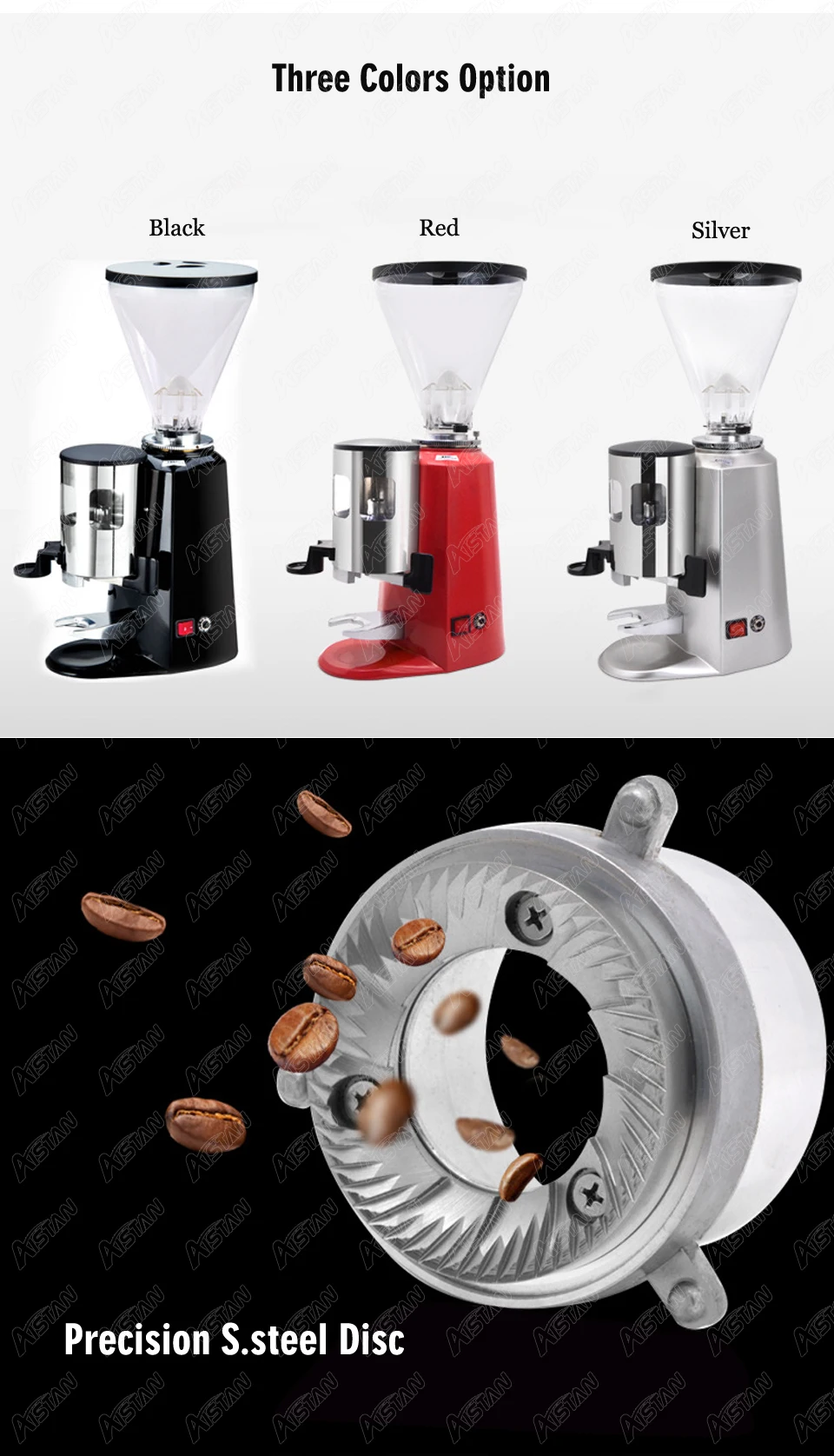 1. Промышленный экструдированный алюминиевый корпус, острое лезвие из нержавеющей стали, прочный, быстрый, чистый. 2. Быстро Измельчить кофейные зерна, не влияя на оригинальный вкус 3. Специально закаленные рабочие стальные шлифовальные камни 4. Мощная Электрическая передача с низким уровнем шума 5. Толщина кофейные бобы порошок можно отрегулировать 6. Выбор цвета: черный/красный/серебристый