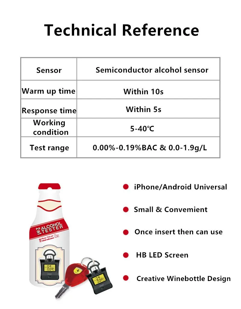 Этот продукт является 2 в 1 цвет Алкотестер предназначен для устройств Apple и Android. Это маленький, изысканный и нежный дизайн, его так легко носить с собой!