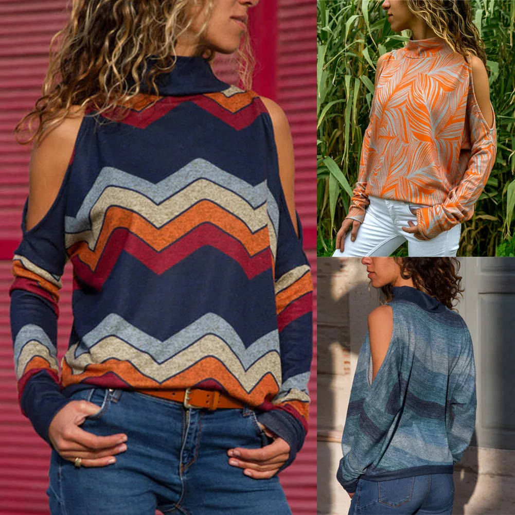 Женский свитер с открытыми плечами и вырезом-черепашкой, свитер с длинными рукавами, блузка, рубашка