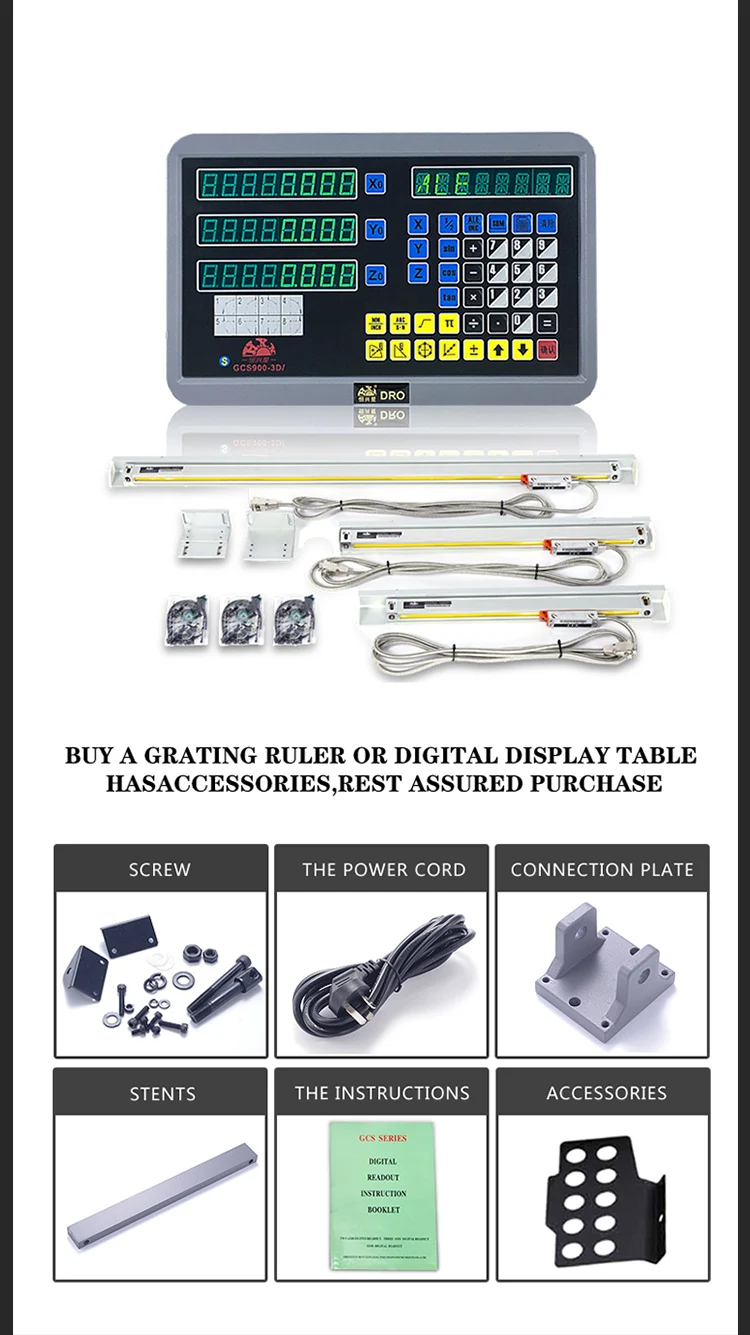 1.Этот заказ включает в себя: 1 шт. цифровой индикации GCS900-3D/ , с 3 шт. линейных весов, точность 5 мкм, Длина путешествия между 50-1000 мм (длина путешествия может быть изменена, общая длина = длина перемещения + 138 мм). С монтажным кронштейном, соединительным кабелем, это один комплект.
