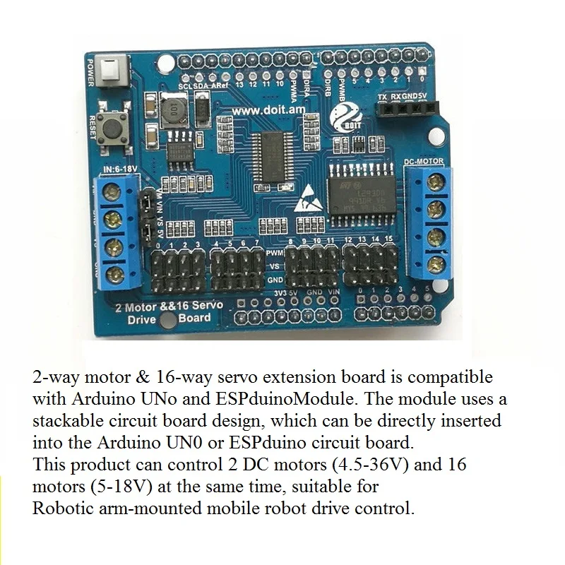 Плата разработки ESPduino разработана компанией doit на основе ESP8266, которая совместима с Arduino UNO R3. Это все норм но к Wi-Fi версии Arduino. Этот Совет по развитию комплект может управлять 2-way мотор и 16-ходовой сервоприводом в одно и то же время. Таким образом, этот комплект очень подходит для управления мобильным роботом, таким как рычаг мобильного робота, который должен управлять двигателем, чтобы позволить автомобилю двигаться, и управлять сервоприводом, чтобы позволить сервоприводу двигаться. В addtion плата ESPduino аналогична версии Arduino WiFi. Таким образом, очень удобно управлять роботом.
