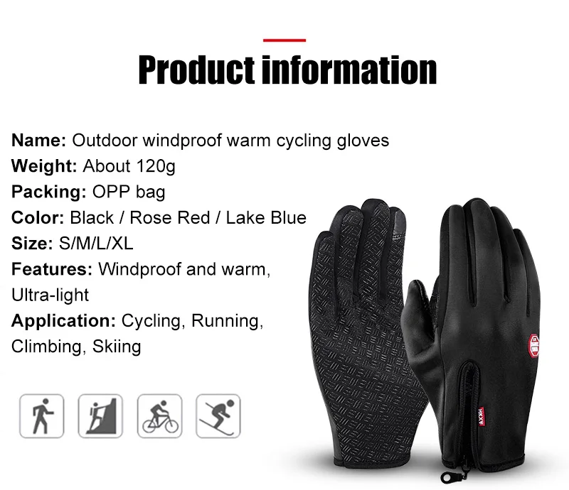 Информация о продукте Название: ветрозащитные теплые велосипедные перчатки Вес: около 120 г Упаковка: OPP мешок Цвет: черный/розово-красный/голубой Размер: S/M/L/XL Особенности: ветрозащитный и теплый, ультра-светильник Применение: езда на велосипеде, бег, альпинизм, катание на лыжах