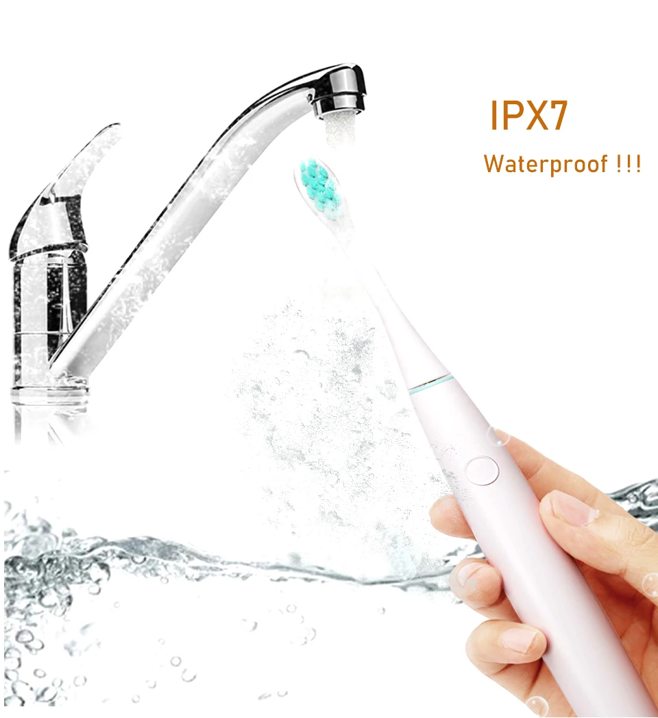 Эта электрическая зубная щетка IPX7 полностью водонепроницаемая! Вы можете мыть его непосредственно под водопроводом! Легко держать в чистоте!
