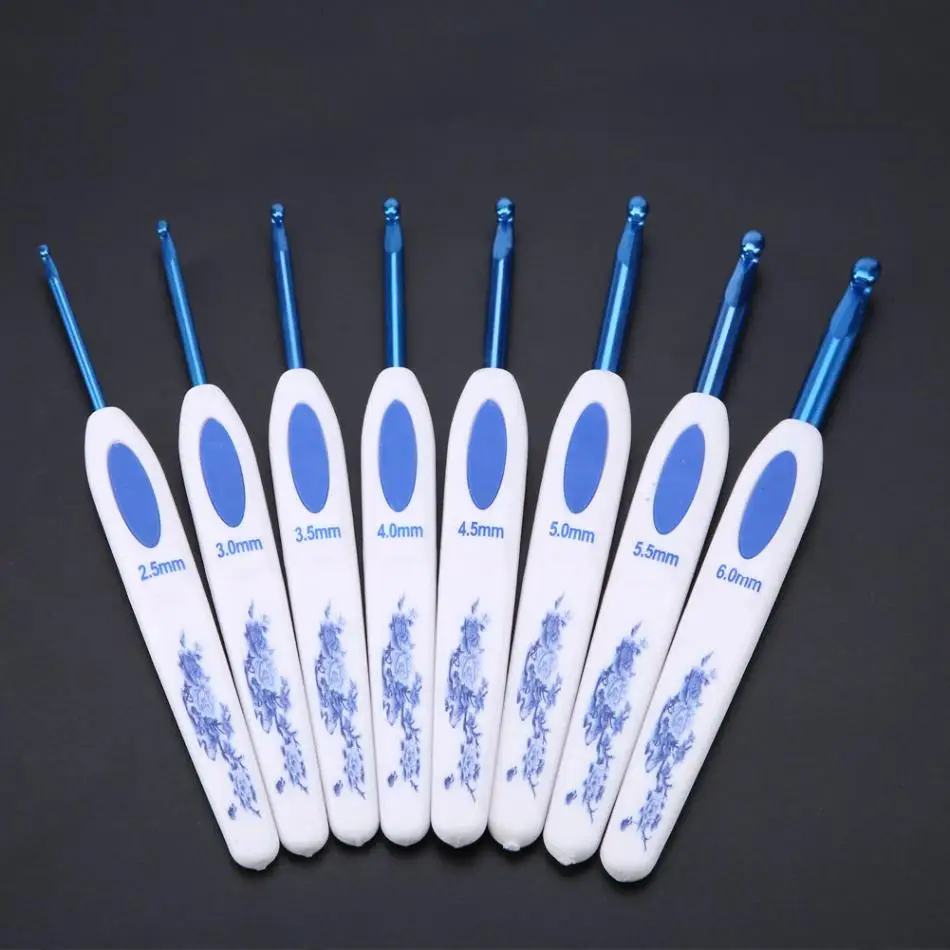 8pcs Blue & White Porcelain Printing Handle Aluminium Crochet Hooks Needles Knitting Craft