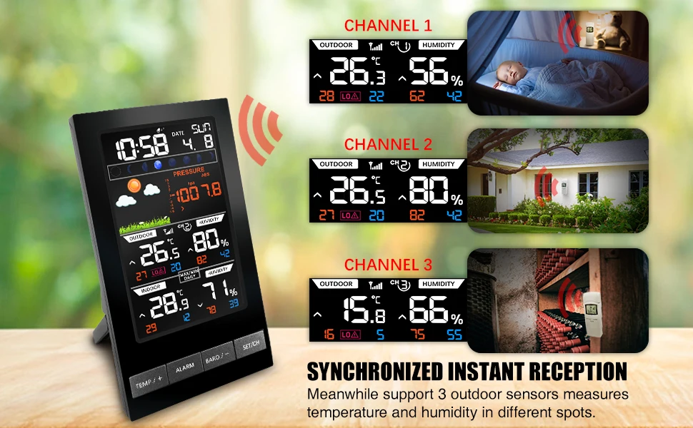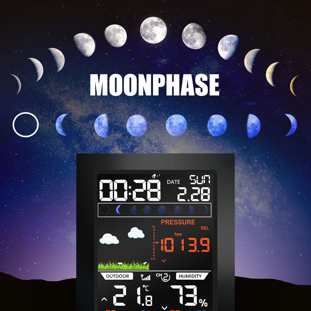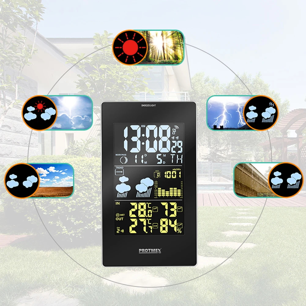 Многочисленные сведения о дисплее Экран обеспечивает время, дату, будний день, температуру в помещении и на улице, влажность в помещении и на улице, фазу Луны, давление, прогноз погоды и уровень комфорта в помещении, которые помогут вам подготовить заранее. -Динамический прогноз погоды Он предполагает шесть видов погоды: солнечную, слегка облачную, облачную, дождливую, сильную дождливую и снежную. Отчеты о изображении яркие и четкие. -Регулируемая яркость подсветки Его яркость подсветки регулируется для удовлетворения ваших различных потребностей в освещении. -Прогноз фазы Луны В соответствии с фазой Луны, мы можем узнать о тенденции прилива, которая полезна для тех людей, которые работают в индустрии путешествий, морского рыболовства, марикультуры и так далее. -Функция сигнализации Вы можете использовать его в качестве будильника, который хорошо подходит для управления временем. -Широкое применение Благодаря компактному дизайну, легко хранить и носить с собой, вы можете взять его с собой или положить в любое место, где захотите, например, в спальню, гостиную, офис и т. д. Технические характеристики Материал корпуса: пластик Тип дисплея: Цифровой Особенность: Античный стиль Тип Motivity: Цифровой Стиль: короткий Комплектация: 1 цветной экран, часы прогноза погоды, 1 беспроводной наружный датчик, 1 адаптер, 1 руководство пользователя на английском языке