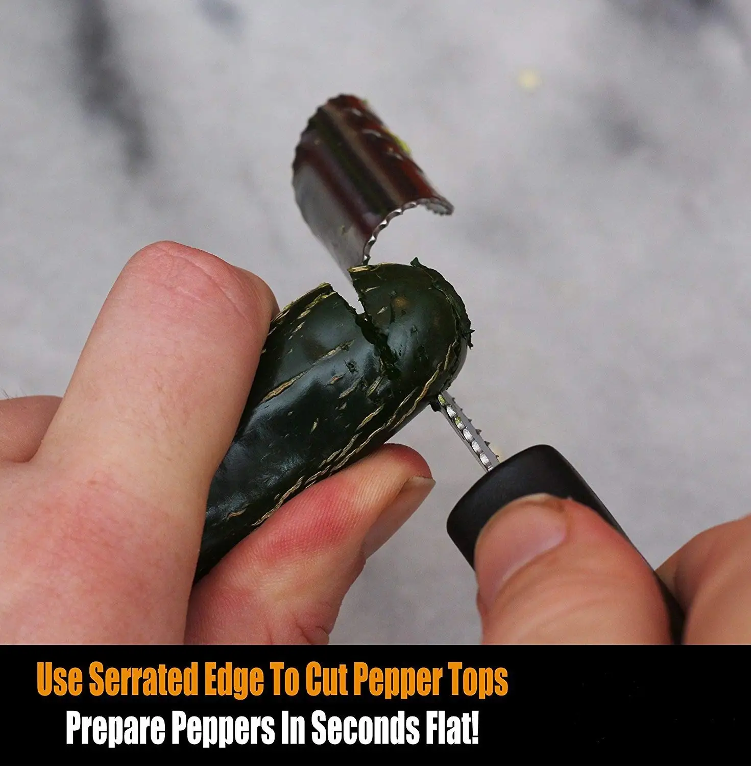 Свести к минимуму раздражение-руки никогда не прикасайтесь к острым перцам! Используйте этот корер для предотвращения контакта с кожей. Выполняйте свою работу быстро и легко-нержавеющая сталь с прорезиненной ручкой. Зубчатые края и острые внутренние зубы. Несколько видов применения-отлично подходит для перцев небольшого и среднего размера. Также идеально подходит для огурцов, томатов и яблок. Инструмент для резки зубчатых кромок для резки топов от Jalapenos, Chilis, Banana, Green, Red и Bell Peppers Размер: 20*3*2 см