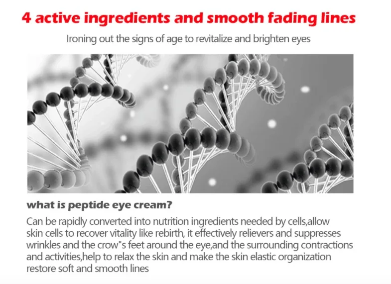 Характеристики продукта: сочетание богатой пептидной коллагеновой эссенции и пробиотической технологии обладает мощной способностью регенерировать и восстанавливать поврежденные клетки кожи. Это может смягчить напряжение кожи вокруг глаз, увлажнить, затянуть и восстановить кожу, уменьшить появление морщин и морщин. В то же время, он имеет функции удаления темных кругов и анти-отечности, анти-старения и ускорения регенерации текстуры кожи, и интенсивно увлажняет сухую кожу. Область применения: подходит для кожи глаз с темными кругами, отечностью, сухими, морщинками и другими проблемами ..