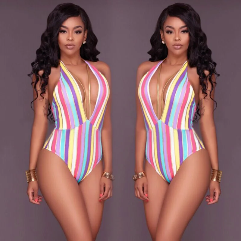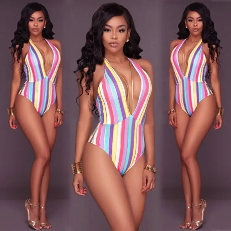 2018 сексуальный купальник в радужную полоску Женский Цельный купальник с высоким вырезом бандо монокини с открытой спиной купальный костюм Пляжная одежда трикини