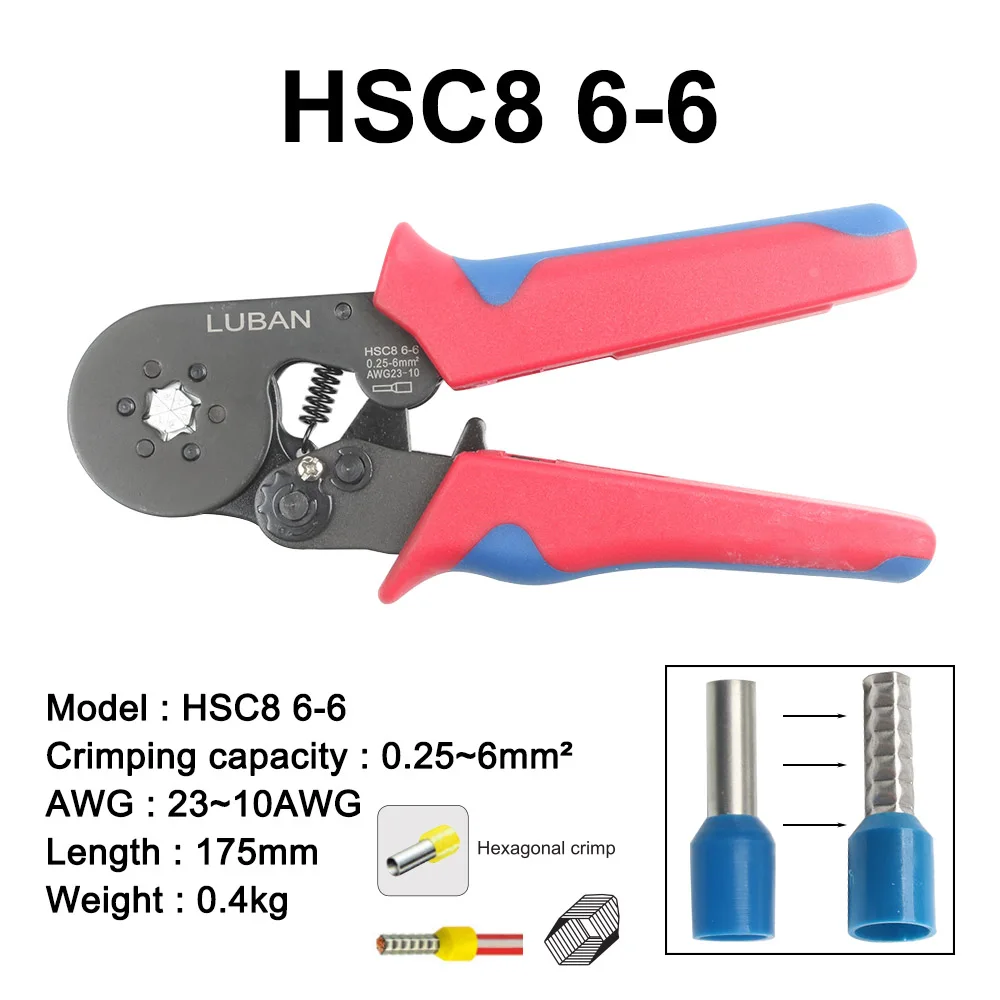 Mini-type self-adjustable crimping plier quadrilateral 1.It is applicable for crimping terminals and pre-insulated terminal on non-welding connection complied with standard electrical connection. 2.When crimping, the terminal should be put into crimping pliers laterally. 3.The demanded pressing force must be reached before the brake unit automatically release the jaw of the pliers. 4.Thus high quality crimping standard could be ensured during repeatedly crimping. 5.Due to perfect gripping position fixed and logical and light structure and the handle shape design meeting human being engineering principle, it reduces fatigue degree. Range of application: cable end-sleevescapacity: 0.08-6.0mm2AWG:24-10AWG length:175mm weight:0.36kg