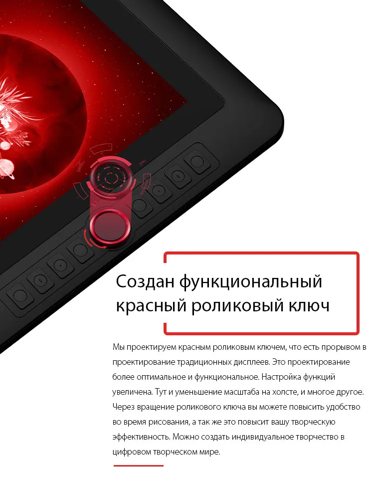 Мы проектируем красным роликовым ключем, что есть прорывом в проектирование традиционных дисплеев. Это проектирование более оптимальное и функциональное. Настройка функций увеличена. Тут и уменьшение масштаба на холсте, и многое другое. Через вращение роликового ключа вы можете повысить удобство во время рисования, а так же это повысит вашу творческую эффективность. Можно создать индивидуальное творчество в цифровом творческом мире.