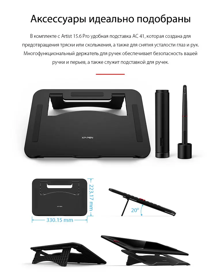 В комплекте с Artist 15.6 Pro удобная подставка AC 41, которая создана для предотвращения тряски или скольжения, а также для снятия усталости глаз и рук. Многофункциональный держатель для ручек обеспечивает безопасность вашей ручки и перьев, а также служит подставкой для ручек.