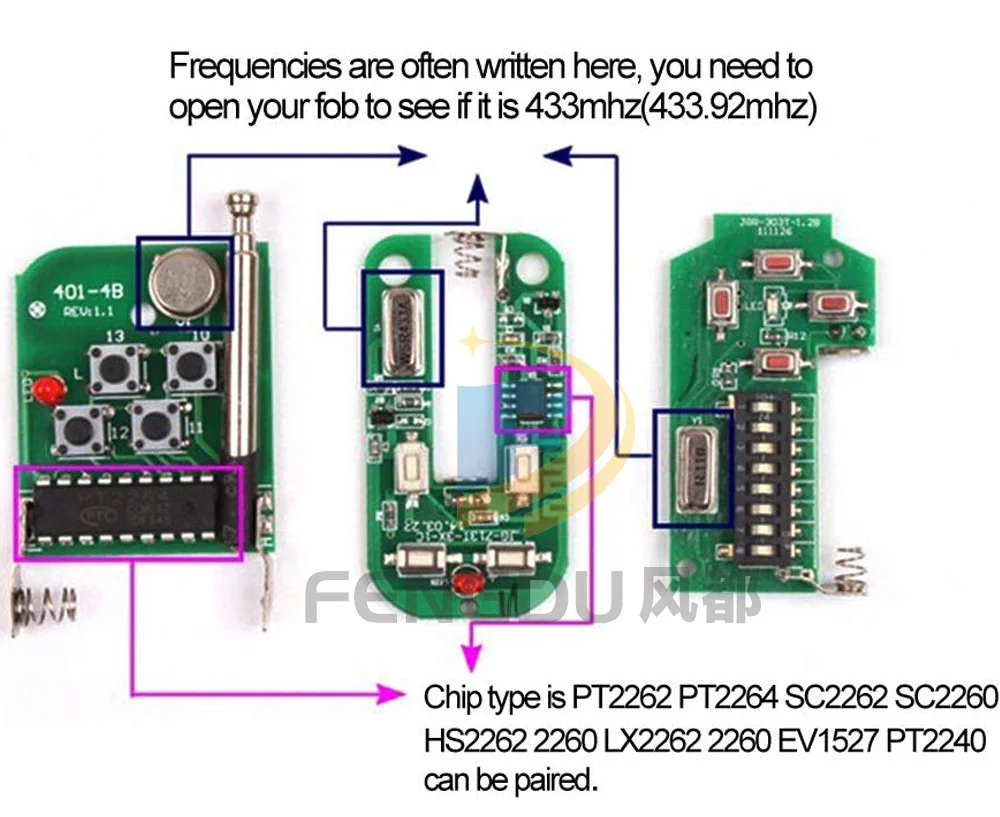 * Высокая справляющаяся способность: Поддержка справляющихся следующих кодов: PT2262 PT2264 PT2260, PT2240, PT1527, SC2262, SC2260, EV1527, SCT527, HS1527, hs2227, HS2260 LX2260 EV1527, FP1527 HS2262 HS2260 LX2262 И т. д. кодирующий чип (с помощью этого удаленного дубликатора вы можете Клонировать все брелоки с фиксированным кодом 433,92 МГц. Некоторые пульты, использующие эту частоту, перечислены выше. Если вы не можете выполнить копирование при правильной работе, вам может потребоваться проверить, есть ли у вашего устройства чип выше).