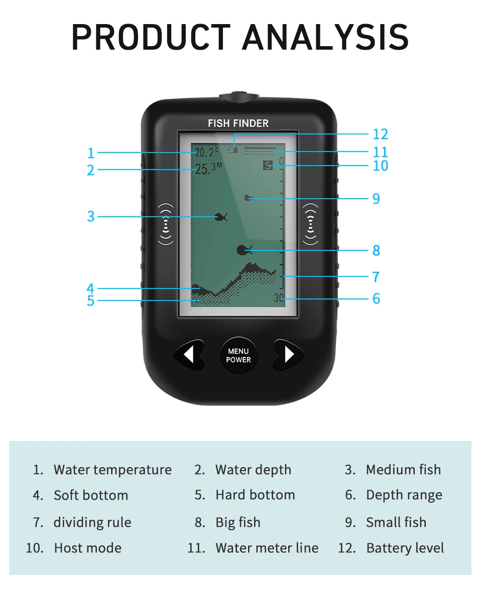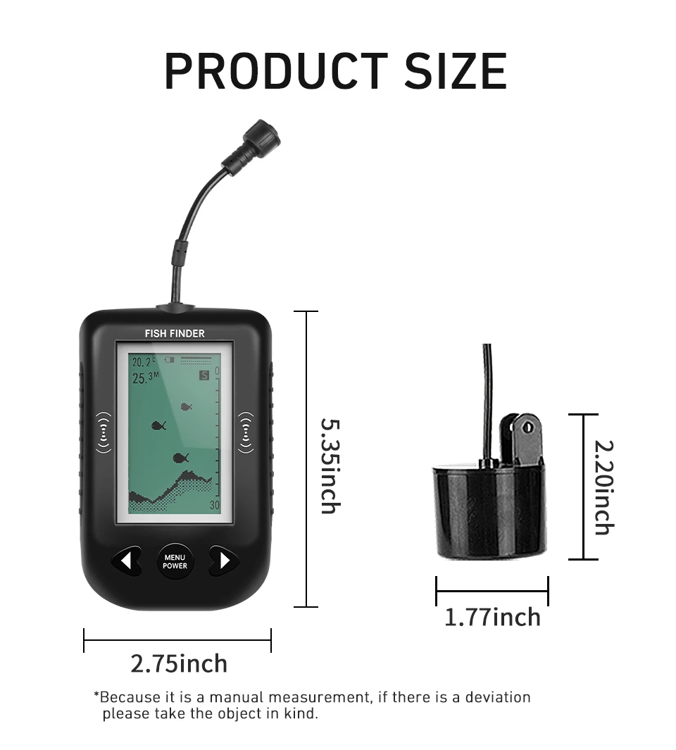 Подсветка: Белый светодиодныйПитание: 4-AAA батареи(Не входит в комплект)Угол луча датчика: 45 градусовГлубина Диапазон: 0,6-100 метрРабочая температура:-18 °C-50 °CТовары включают:1) Круглый преобразователь с кабелем 25 футов2) переходное устройство3) нержавеющий болт, гайка4) шейный ремешок5) руководство по эксплуатации (на английском языке)Продавец обманывает. Не добросовестный.... Читать отзыв полностью...