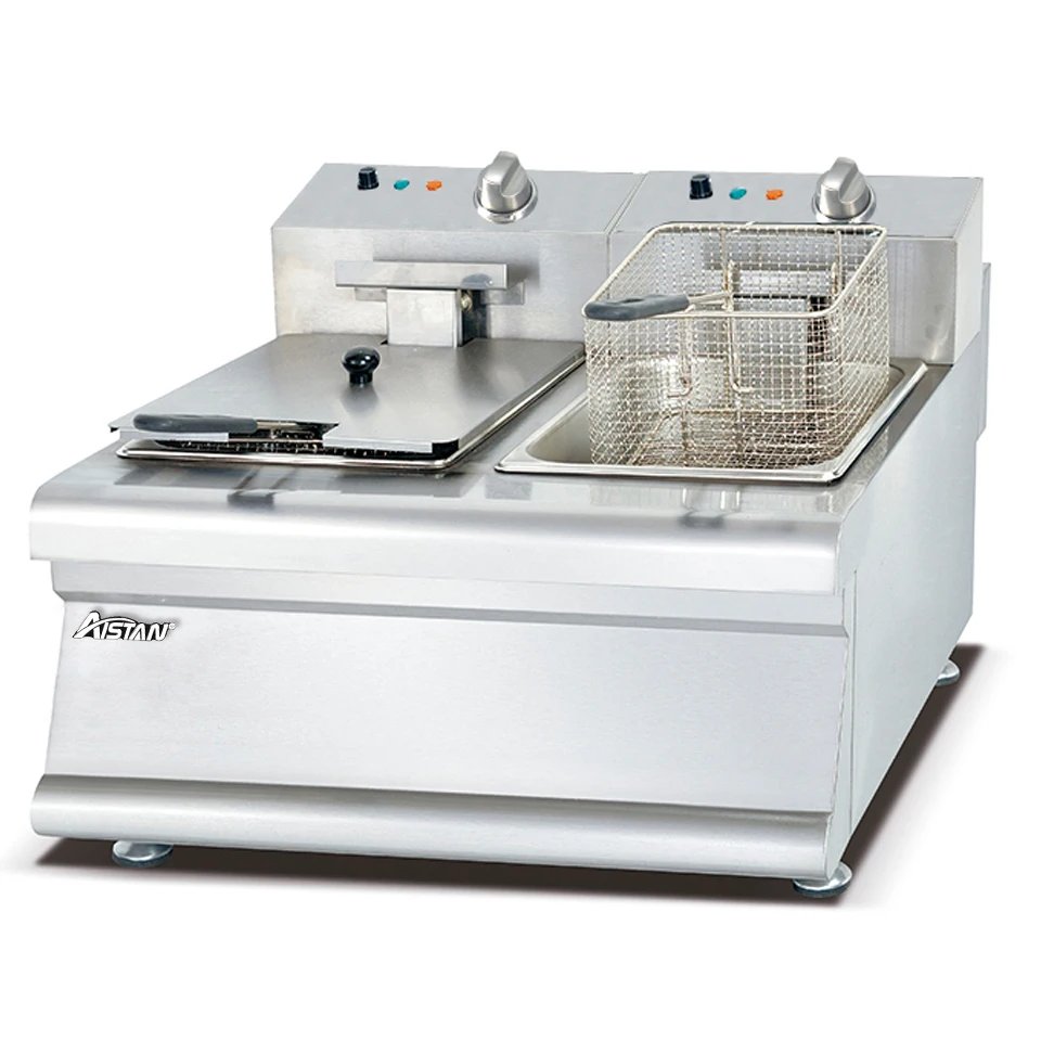 Столешница фритюрница Размер: 600x600x430мм Мощность: 2,8 + 2.8KW Емкость: 8 + 8 л Вес нетто: 25 кг