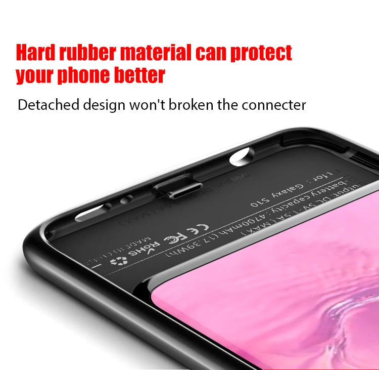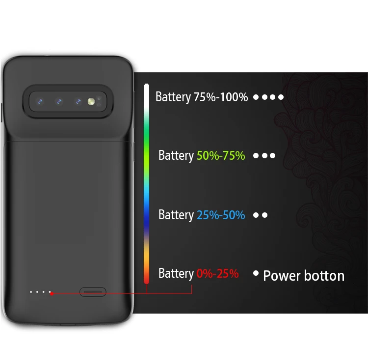 Внимание: те чехол без функции беспроводной зарядки. Не поддерживает функцию быстрой зарядки, не поддерживает синхронизацию данных и andriod play или для samsung play Примечания: ---- Не поддерживаются NFC, наушники Samsung Dex или Android Auto или проводные наушники. ---- Этот чехол не предназначен для защиты экрана. ---- Этот чехол для аккумулятора не совместим с защитным стеклом с полным краем. ---- Нажмите кнопку питания один раз, чтобы начать зарядку. Нажмите его в течение 3-5 секунд, чтобы прекратить зарядку Характеристики изделия: Модель 1: чехол для аккумулятора Samsung note 10 5200 мАч Модель 2: чехол для Samsung note 10 plus 6000 мАч Модель 3: чехол для аккумулятора Samsung S10e 4700 мАч Модель 4: чехол для аккумулятора Samsung S10 4700 мАч Модель 5: чехол для аккумулятора Samsung S10 plus 5000 мАч Модель 6: чехол для аккумулятора Samsung note 20 6000 мАч Модель 7: чехол для Samsung note 20 ultra 6000 мАч Вход: 5 В/1,8 А Выход: 5 В/1,5 А Посылка входит: Чехол для аккумулятора x 1 Руководство пользователя x 1 1. Чехол Power bank 3. Отделка резиновым маслом на поверхности, гладкая и комфортная на ощупь. 4. С 4 светодиодный ными индикаторами. 5. С защитной печатной платой, избегайте перезаряда, перегрева и т. Д.