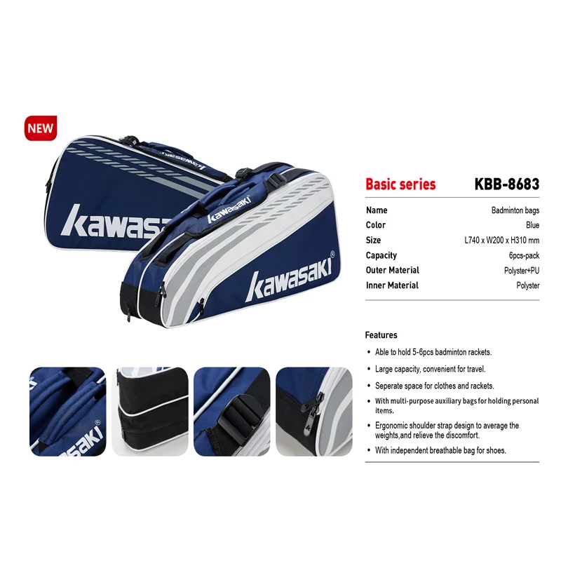 Обзор:Сумка для ракетки для бадминтонаKawasaki KBB-8641-это сумка для бадминтона, в которую можно положить 3-6 штук ракетки для бадминтона, чайник, одежду, ключи, мобильный телефон, салет и воланыХарактеристики:Спортивная сумка*Название:Сумка серии KBC для бадминтонаСпортивная сумка*Модель:KawasakiKBB-8641Сумка для порта*Цвет:СинийВасаки*Размеры:750x310x220 ммKawasaki*Емкость:Сумка для бадминтона из шести упаковокKawasaki*Материалы:ФарбрикG*Внутренние материалы:ФарбрикГайкиОсобенности* Большая вместимость, чтобы удовлетворить потребности в поездках* Изоляционный слой из алюминиевой фольги, эффективно защищает ракетки*Отдельный мешок для ракеток, обуви и одежды, Эргономичный удобный ремешок* Можно положить 3-6 штук ракетки для бадминтона* Избегайте повреждения оборудования из-за внешней температуры* Подходит для хранения