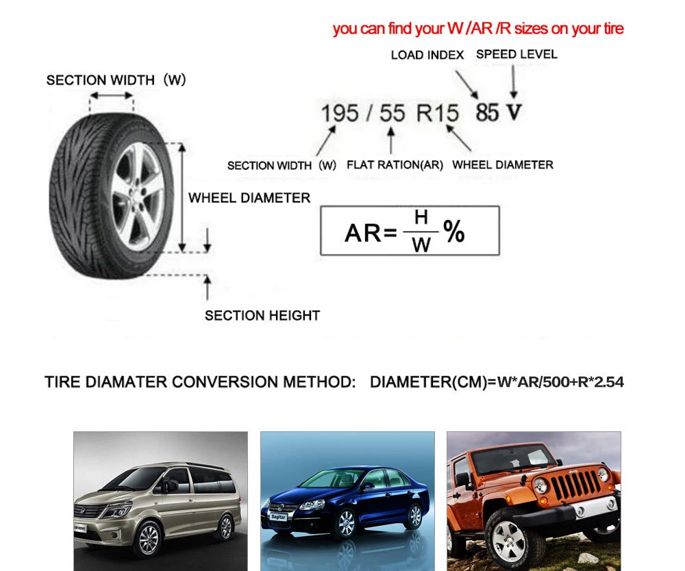 Например, если ваша шина 195/55R15 85V A = 195 B = 55 C = 15 Диаметр шины = A * B/500 + C * 2,54 = 195*55/500 + 15*2,54 = 59,55 см Поэтому вы можете выбрать размер S